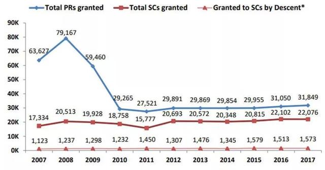 大家估计也听说过新加坡以前是“送身份”的。在大概10-20年前,那时候涌现了大量移民。后来,人多造成资源紧张,“鱼龙混杂”的新公民又难融入各种社会问题出现,新加坡移民政策就日渐收缩了。从2000-2010这10年间,永久居民人数增加了25万左右,2010年达到了54万,但是2010年以后甚至负增长,永久居民人数现在只维持在52万左右。