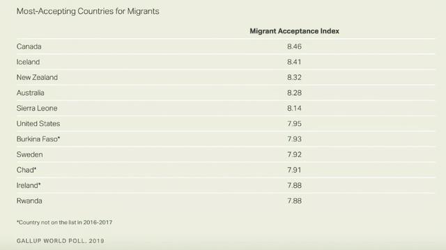 知名分析公司Gallup在今年9月发布了2019年移民接受度指数(Migrant Acceptance Index)。
