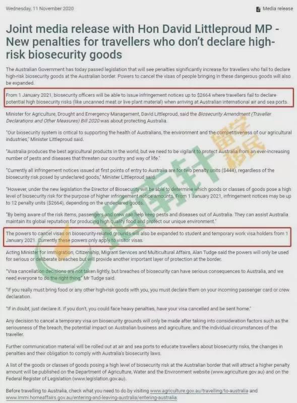 11月11日,澳洲政府最新通过了一项立法《2020年生物安全修正案(旅客申报和其他措施)法案》(Biosecurity Amendment (Traveller Declarations and Other Measures) Bill 2020),那些携带高生物安全风险物品且未在边境申报的来澳旅客会面临更严格的处罚。而且,违规还会危及学生签和临时工作签。