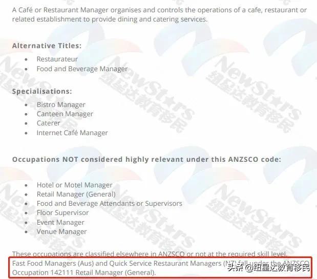 参考上述标准后,再结合VET官网公布的职业分类清单,我们就能够发现该申请人可以操作的职业非常有限,而这里最容易掉的坑就是把申请人的提名职业定位为餐厅经理,141111 Cafe or Restaurant Manager也是一个C类职业,但一定要注意的是像披萨店这种快餐店的餐厅经理是不包括在这个类别之下的,快餐店经理属于零售经理,而零售经理142111是不在技术移民清单中的,只能做494偏远地区雇主担保项目,提名改职业无法给配偶在技术移民申请中加分。