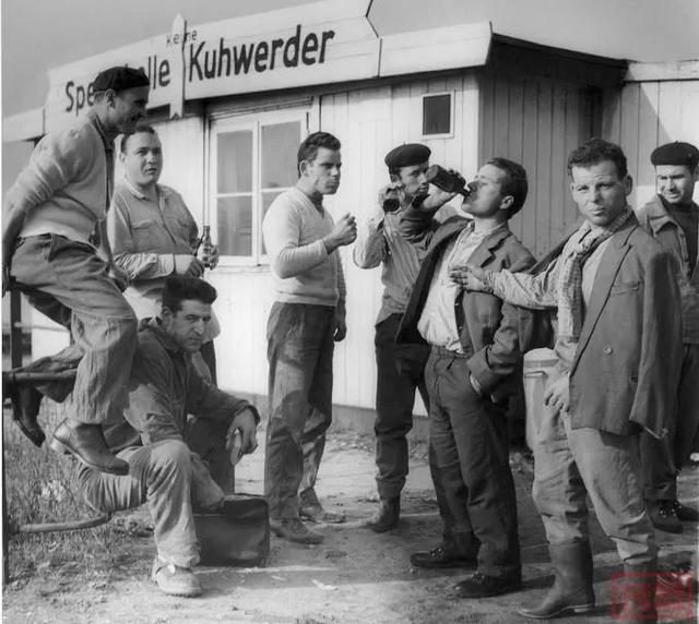 第一批50名员工于1956年1月5日来到德国,而在同年4月,又一批规模更大的1400名季节性工人离开了意大利。到年底,德国工雇用了大约10000名外来工人,主要从事农业和建筑业。融合对当时的德国来说是不存在的,因为这些来自意大利的所谓的外来劳工是与当地居民分开居住的。如图:1960年:意大利码头工人在汉堡港的Kuhwerder码头吃早餐休息: