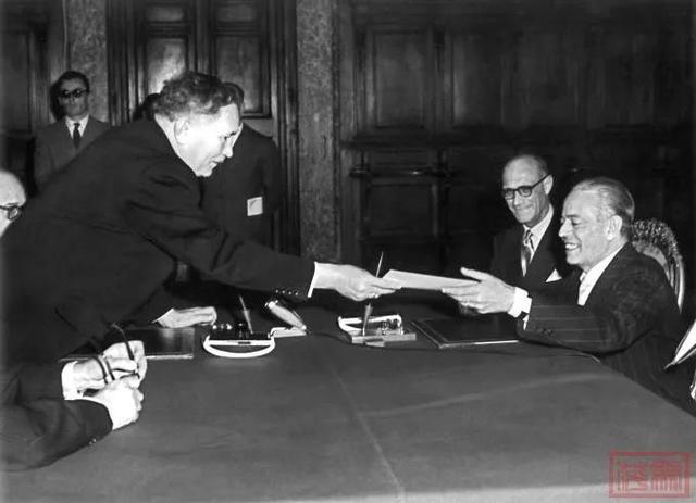 12月,德国和意大利终于达成了“关于在德意志联邦共和国招募和安置意大利工人的协定”。如图,1955年12月21日,在罗马签订协议:
