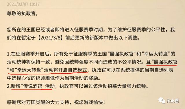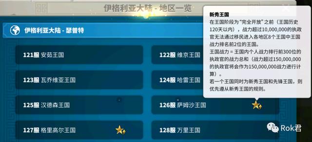 本次主要是先锋王国和新秀王国的规则更改。也就是王国的前120天内只会存在新秀王国。所谓新秀王国就是:同一块大陆上,王国内前300玩家战力之和最高的两个国家。
