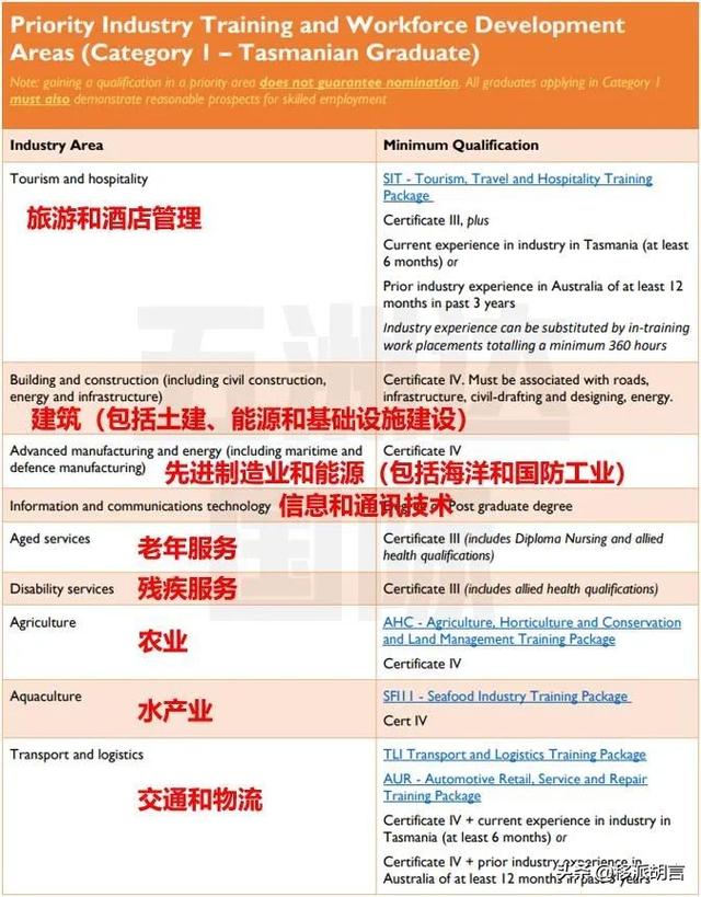 就读Certificate 3或4课程的申请人,必须满足塔州优先行业培训和劳动力发展领域(Priority Industry Training and Workforce Development Areas)的要求。PITWDA清单是塔州希望他们的移民重点发展的一个新的行业领域清单,它包括8个领域和每个领域的最低资格要求。
