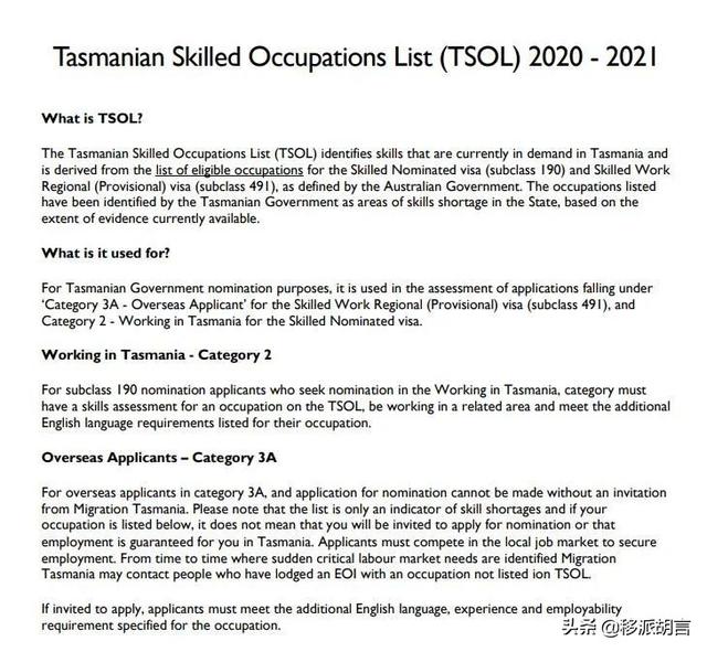 TSOL链接:https://www.migration.tas.gov.au/__data/assets/pdf_file/0003/279606/Tasmanian_Skilled_Occupation_List_-_January_2021_020221.pdf