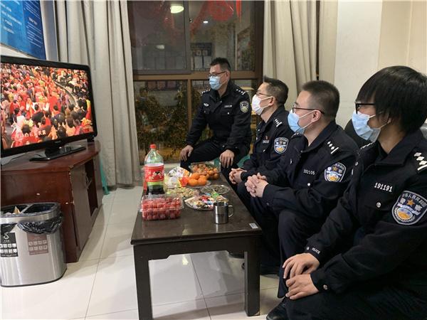民警纪洪阳在执勤间隙和同事们一起收看春节联欢晚会。