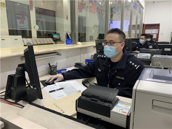 民警纪洪阳在春节期间坚守岗位为船舶办理出入境边防检查手续。