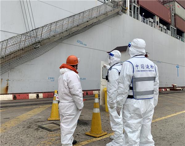 昨天(16日)下午2时许,外高桥边检站民警严格按照疫情防控要求,在中国香港籍“浙江”轮船舶梯口,安全高效地为8名登离轮船员办理了边防检查手续,确保船员在实现疫情防控闭环管理下尽快亲人团聚。