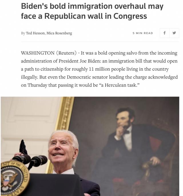 △路透社称,拜登政府大刀阔斧的移民改革将在国会面临共和党围堵