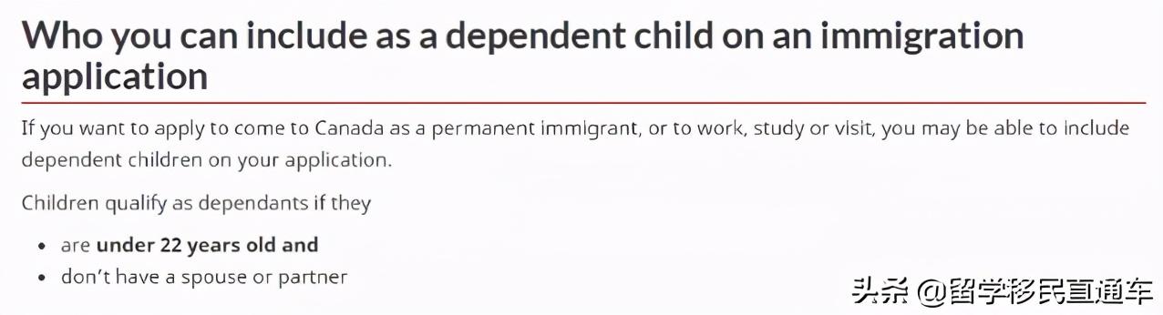 申请加拿大移民,子女随行的年龄是22岁以下,子女年龄以收到移民申请时为准。这也正是为什么加拿大移民机构常说“一人申请,全家移民”的原因。