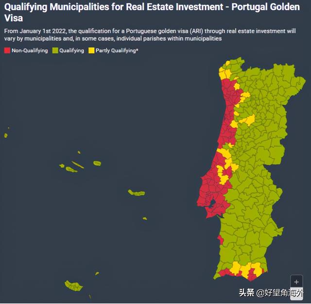 最低投资要求维持不变为50万欧和35万欧(翻新房),但是投资房产区域仅限于该国内陆地区以及亚速尔和马德拉自治地区。内陆地区是指按照人口密度、居民定居点、领土物理特征、社会经济等因素划分的经济地区,具体涵盖165城市和县区(下图绿色区域)和73个教区(下图黄色区域)。