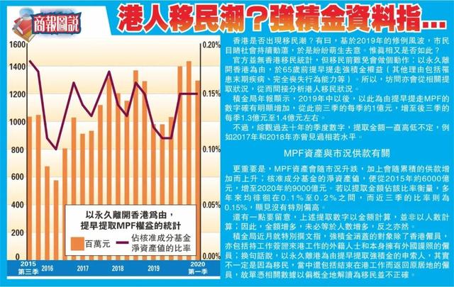 不少港人移民前难免会做个动作:以永久离开香港为由,于65岁前提早提走强积金权益(其他理由包括罹患末期疾病、完全丧失行为能力等)。所以,坊间亦会从相关提取状况,从而间接分析港人移民状况。