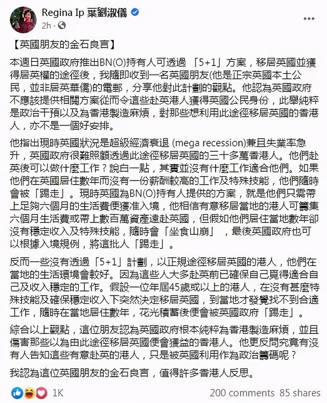 无独有偶,叶刘淑仪今日也在FB发帖,转述了一个港人赴英「搵工难」的故事。