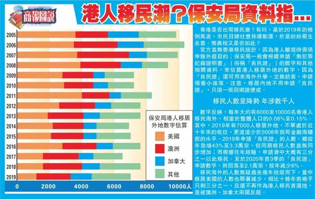 数字反映,每年大约有6000至10000香港人移民海外,相当于整体人口的0.08%至0.15%。其中,2019年有7000人移居外地,不单处于近十年来的低位,更远远少于2008年前即金融海啸前的水平。2019年申请「良民证」的人数,虽按年急增43%至3.3万宗,但同期移民人数并无同步增加;而根据往年经验,申请者中大概有三分之一以此移民。至于2020年首3季的「良民证」申请数字,则回落至2.1万宗,按年减少6%。
