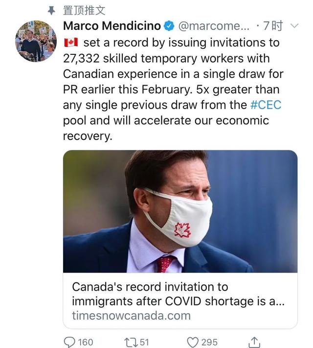 移民部长今天(2月23日)发布并置顶的推特中,也提到了2月初邀请的27,332名申请人创下了历史记录,邀请人数是以往筛选的5倍,这将加速加拿大经济复苏。