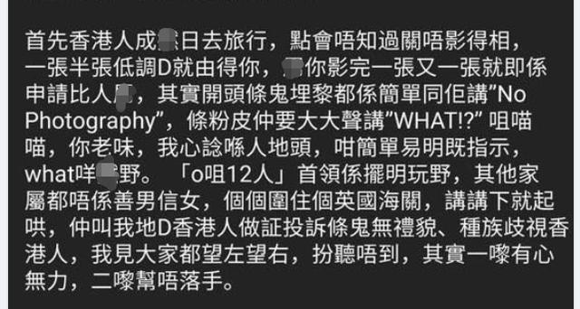 早前facebook专页“Goodbye HK Hello Billy”发布帖子,称从一名在英国内政部担任督察级关员口里得知,12名持有BNO的人士在等候申请LOTR时,在关口大摇大摆拍照,关员随即喝止有关行为。但有人不断起哄,煽惑他人非法冲关,并发生推撞。结果一行12人被带入房间,其间有人粗口横飞。结果拘留一晚之后,12人随即被递送返港。