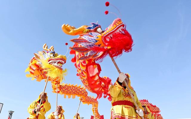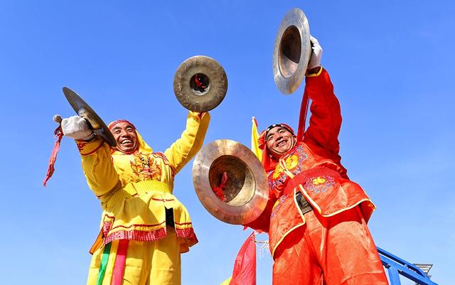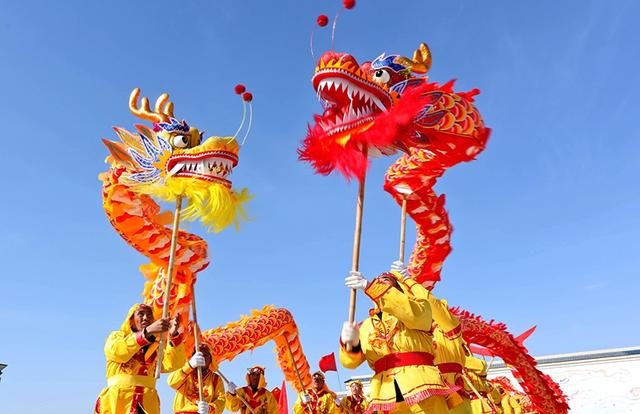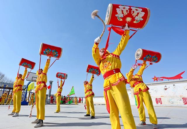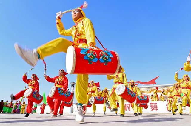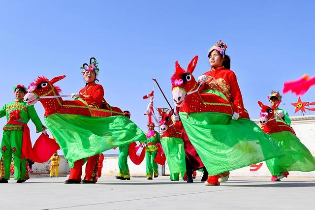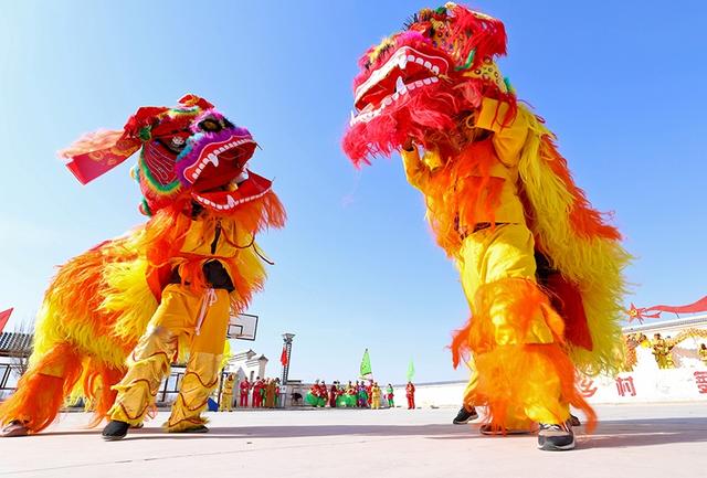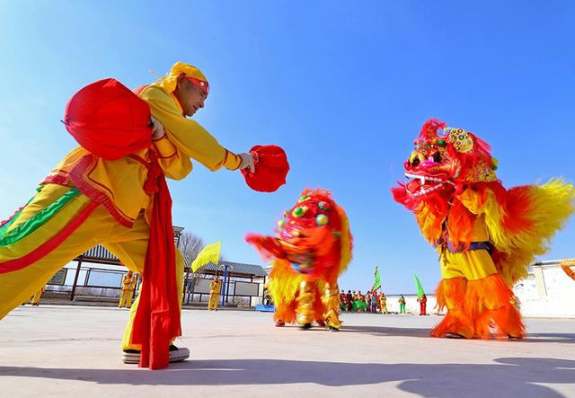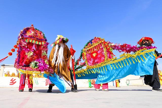 2021年2月24日,甘肃张掖高台县骆驼城镇新民村村民自发组织的社火表演队在文化广场上向乡亲们表演盛世龙腾、狮舞、太平鼓、划旱船、秧歌等传统形式新编社火,传递浓浓的乡情乡韵和期盼风调雨顺、五谷丰登,生活越来越好、收入越来越高。