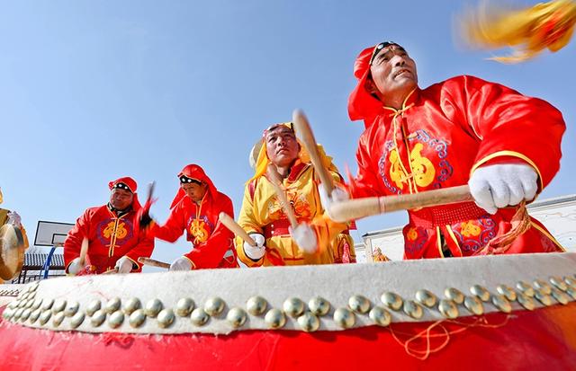 据悉,甘肃张掖高台县骆驼城镇新民村是重点移民扶贫村和精准扶贫村,近年来,通过大力发展种植、养殖等特色优质产业,实现贫困村脱贫摘帽,去年,全村贫困人口人均可支配收入达到15966元。富裕起来的村民干事创业的“牛”劲十足,新春时节,大家自发组建起社火队排练节目,欢庆摘去贫困帽,过上幸福新生活。(记者 王将 贺承冬 摄)