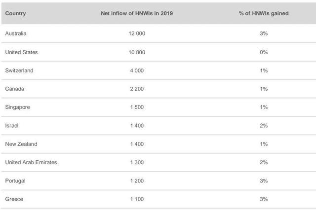 根据这份《2020年全球财富迁移报告》,拥有最多高净值人群涌入的国家是澳大利亚,以在2019年吸引了1.2万高净值移民而超过美国占据榜首。