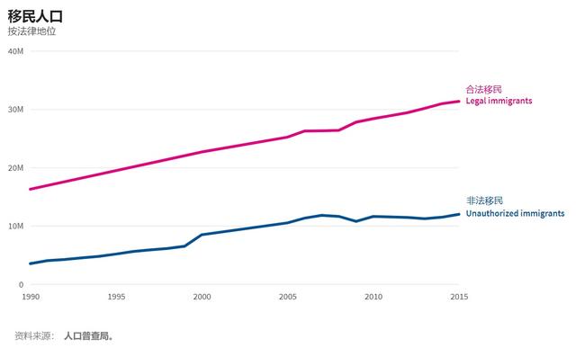 移民人口定义为目前在国外出生的所有美国居民,包括归化公民,绿卡持有人,难民和未经许可的移民。但不包括游客和可能在美国短暂访问的其他人。移民大约占美国人口年增长率的一半,而移民人口占美国总人口的近15%。