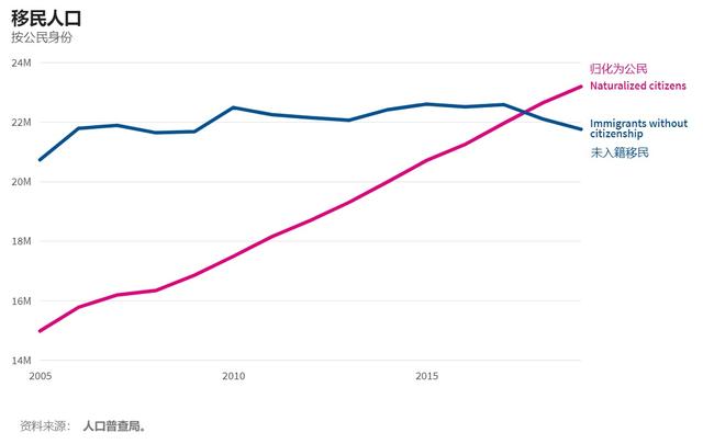 上图:最终归化为公民的人数,显然从来没有下降过。2019年达到23182917。选择不入籍的移民人数小幅波动在2100万人左右。