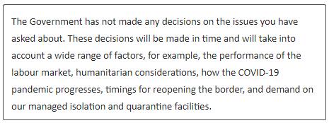 移民局政策经理Andrew Craig在发给中文先驱的一份声明中表示,对于我们问到的这些问题,“政府目前还没有做出任何决定。政府将考虑广泛的因素,例如劳动力市场的表现情况、人道主义因素、新冠疫情的发展情况、边境重新开放的时间以及隔离和检疫设施面临的需求,及时作出相关决定。”