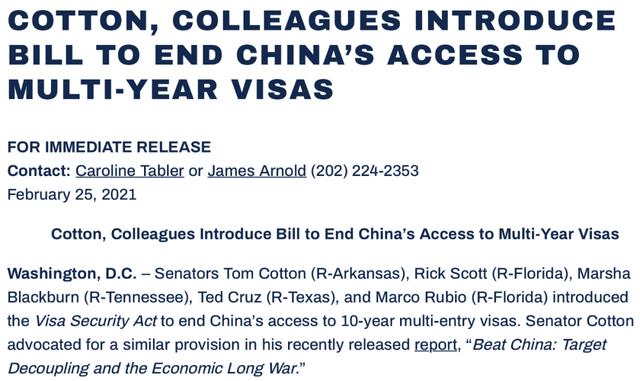 一项名为“签证安全法案”(Visa Security Act)的提案由佛州参议员卢比奥(Marco Rubio)、阿肯色州参议员科顿(Tom Cotton)、佛州参议员斯科特(Rick Scott)、田纳西州参议员布莱克本(Marsha Blackburn)和德州参议员克鲁兹(Ted Cruz)共同提出,要求恢复2014年之前的美国对华签证政策,给予中国公民申请人一年期多次入境签证。
