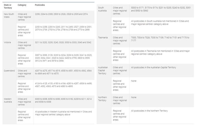 另外,黄金海岸、珀斯、卧龙岗等很多城市地区现在也被划分为偏远地区,有比较多的工作机会。之前担心偏远地区荒无人烟的朋友也可以放心了。如何分辨所居住工作的地方是偏远地区主要看postcode邮编是否在移民局定义的指定偏远地区Designated Regional Area的列表里。列表如下: