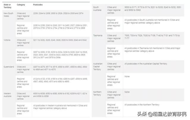 另外,黄金海岸、珀斯、卧龙岗等很多城市地区现在也被划分为偏远地区,有比较多的工作机会。之前担心偏远地区荒无人烟的朋友也可以放心了。如何分辨所居住工作的地方是偏远地区主要看postcode邮编是否在移民局定义的指定偏远地区Designated Regional Area的列表里。列表如下: