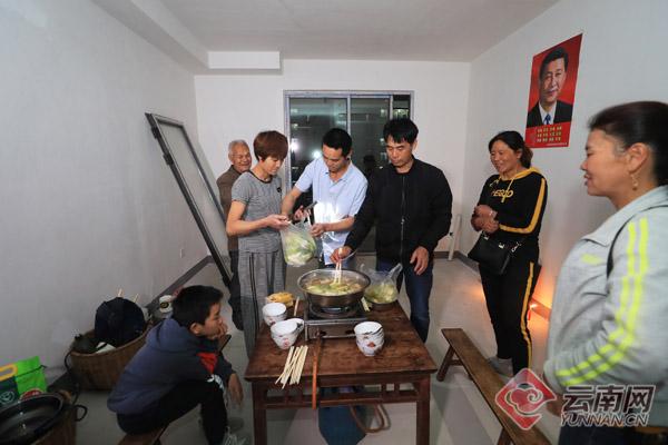 2021年2月28日,云南省昭通市巧家县白鹤滩镇天生梁子集中安置区,吴香发老人一家在新房内吃第一顿早饭。