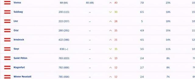 而维也纳也是奥地利最为拥堵的城市,但是排到了89位,其它几座大城市萨尔斯堡、格拉茨等也都排到了200名往后,再小一些的城市就在1000名往后了。