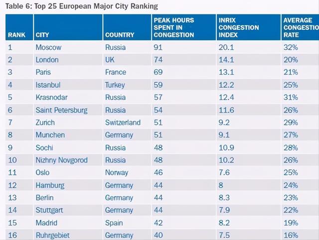最近一家交通服务网站比较了2017年36个国家1360个城市的交通拥堵状况。欧洲最堵的25个城市里德国占了8个,慕尼黑是德国最拥堵的城市,在1360个城市中排35。