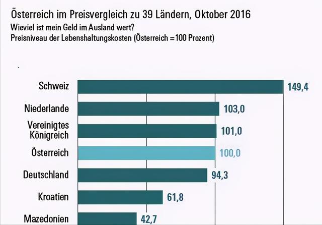 相比之下,德国的物价非常感人,虽然经济发展水平高,但是物价却相对较低,比奥地利低了5%。在奥地利需要花费100欧的东西在瑞士需要149.4欧,但在德国只需要94.3欧。