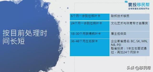 联邦技术移民、大西洋四省AIPP、自雇移民都是一步到位拿枫叶卡的,都比较快,其中联盟技术移民最快,最快6个月就可以拿枫叶卡。