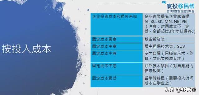 其次,办理成本相对较低的就是加拿大自雇移民、雇主担保类移民和SUV,魁北克投资移民是固定成本最高的移民方式,需要30多万加币,而企业家类移民投资成本需要视情况而定。