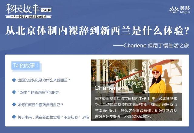 感谢美移的邀请,让我分享我在新西兰的两年生活。我叫Charlene, 国内硕士毕业后留京体制内工作5年,公职裸辞来新西兰边缘院校读旅游管理专业,肄业。现居新西兰南岛但尼丁,搬砖之余喜欢写作,初级红学以及古风音乐爱好者,还喜欢水肺潜水。