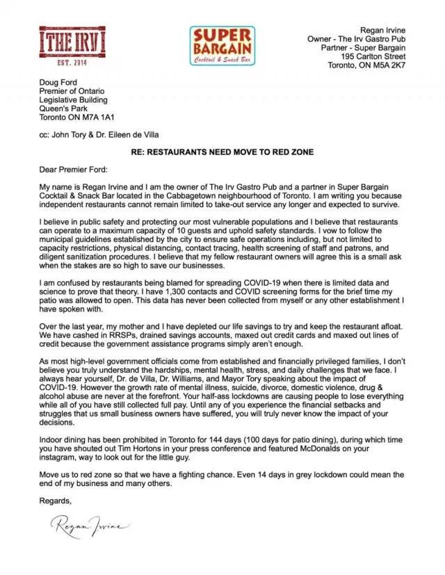 Cabbagetown The Irv Gastro Pub的老板里根·欧文(Regan Irvine)在信中写道,当地餐馆不再只能依靠外卖和送货服务来生存。