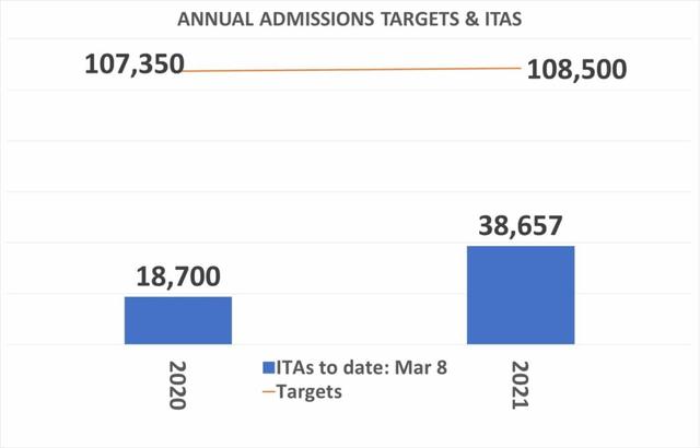 今年截止到母亲加拿大一共发出了38,657份申请邀请函(Invitations to Apply,ITA)。与去年同期相比大约增长了3倍。由于2020年移民数量出于较低的水平,2021年加拿大计划邀请 401,00份新移民申请。
