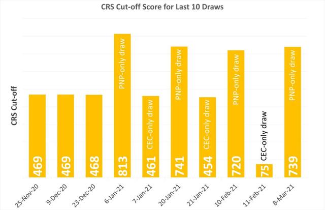 此次加拿大移民部(Immigration, Refugee and Citizenship Canada,IRCC)邀请的最低分数为739分。仅邀请已经获得省提名的一面申请人。这意味着若最低分数达到739分的移民申请人,只要在2021年2月16日之前递交了快速通道创建资料,则都会被邀请。