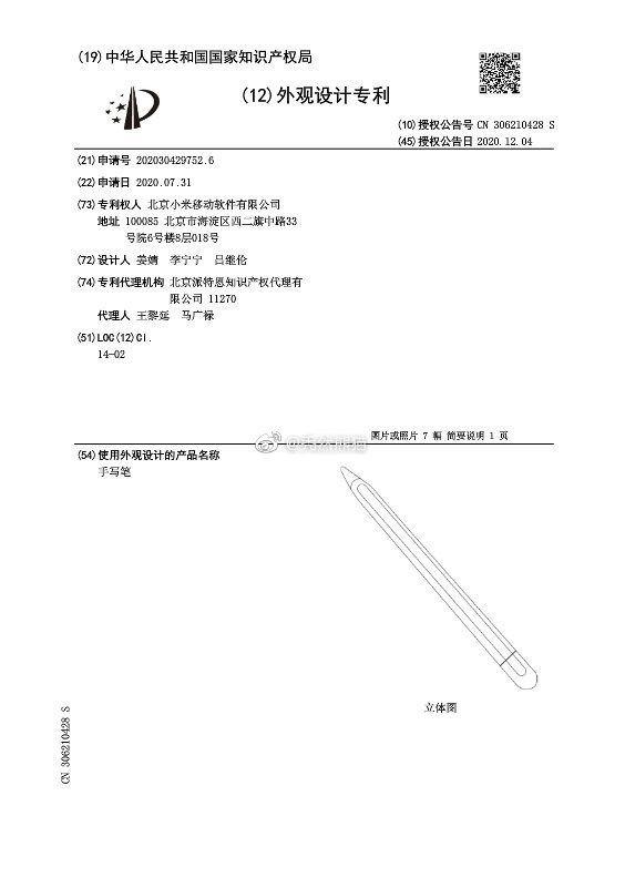 7、小米手写笔专利曝光,外形神似Apple Pencil