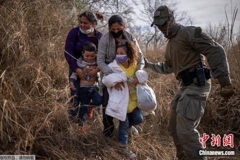 当地时间3月17日,美国得克萨斯州,边境执法人员与前来寻求庇护的非法移民家庭。