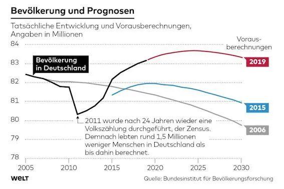 与所有预测相反,德国的人口并未减少,相反:移民足以抵消因死亡而减少人口的影响,出生人数也有所增加,当然主要还是难民的涌入。