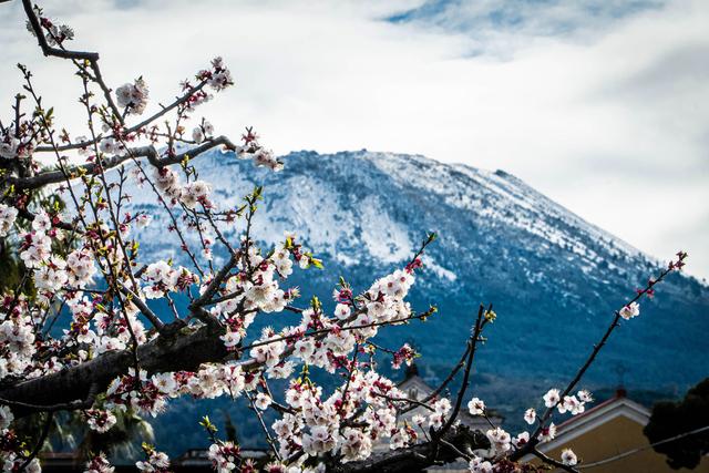 这是3月20日在意大利那不勒斯拍摄的春花掩映下的维苏威火山。