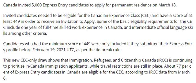 当地时间3月18日,加拿大移民部再一次向EE类别的CEC经验类移民申请人发出了邀请,此次获邀最低分449分,获邀人数5,000人!获邀最低分为449分的申请人,需要在2021年2月19日前入池EE,在这之后入池的申请人此次不会被获邀。