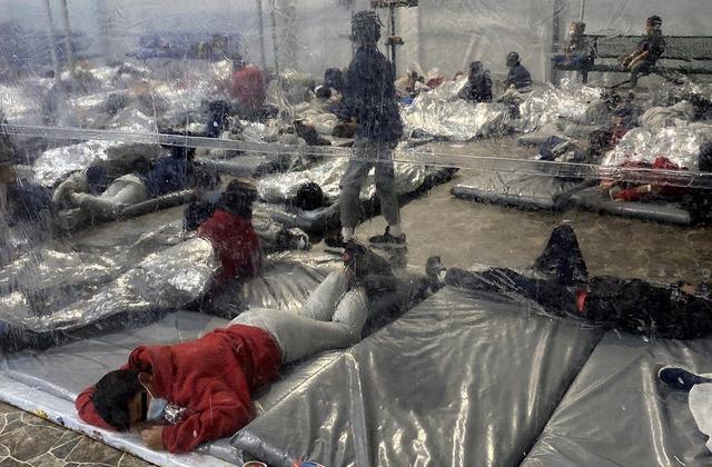据美联社3月22日报道,媒体曝光了一组美墨边境移民帐篷内部的照片,这些景象是拜登政府数周以来一直阻止公众看到的秘密画面:美墨边境被关押的移民儿童横七竖八地睡在垫子上,被塑料板隔开,即使有人戴着口罩但彼此还是靠得很近。