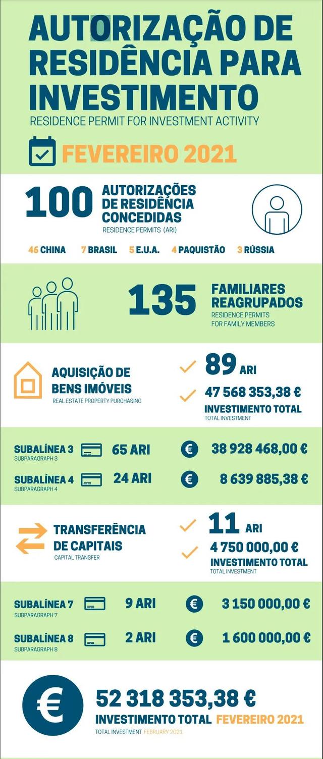 从葡萄牙SEF公布了2021年2月份的最新移民数数据中可以看出,2月份主申请人达9544位,附属申请人达16265位,共有100位主申请人成功取得葡萄牙黄金签证,批准量相较于去年2月份增长了43%。