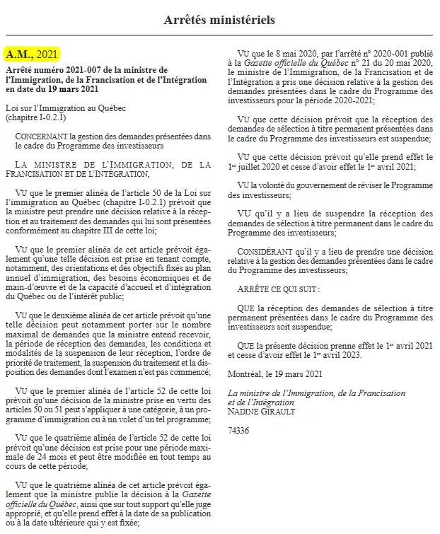 2021年3月31日魁北克投资移民最新消息, 政府会公布这个项目将会暂停到2023年3月31号。