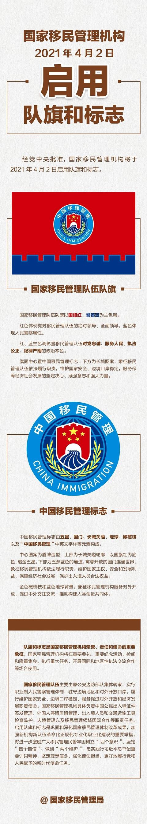经党中央批准,国家移民管理机构将于2021年4月2日启用队旗和标志。