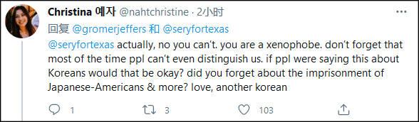 “事实上你不能这么说,你就是个仇外者。别忘了,很多时候美国人根本无法区分亚裔。别人是不是也可以这样攻击韩裔?你忘记当年日裔美国人如何被囚禁了吗?”