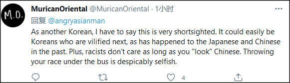 “作为一个韩裔,我不得不说这是非常短视的言论。接下来可能就会轮到韩裔被诽谤,就像华裔和日裔所遭受过的那样。另外,只要你‘看起来长得像中国人’,那些种族主义者就根本不在乎你是谁。把自己的族裔弃之不顾是卑鄙、自私的。”